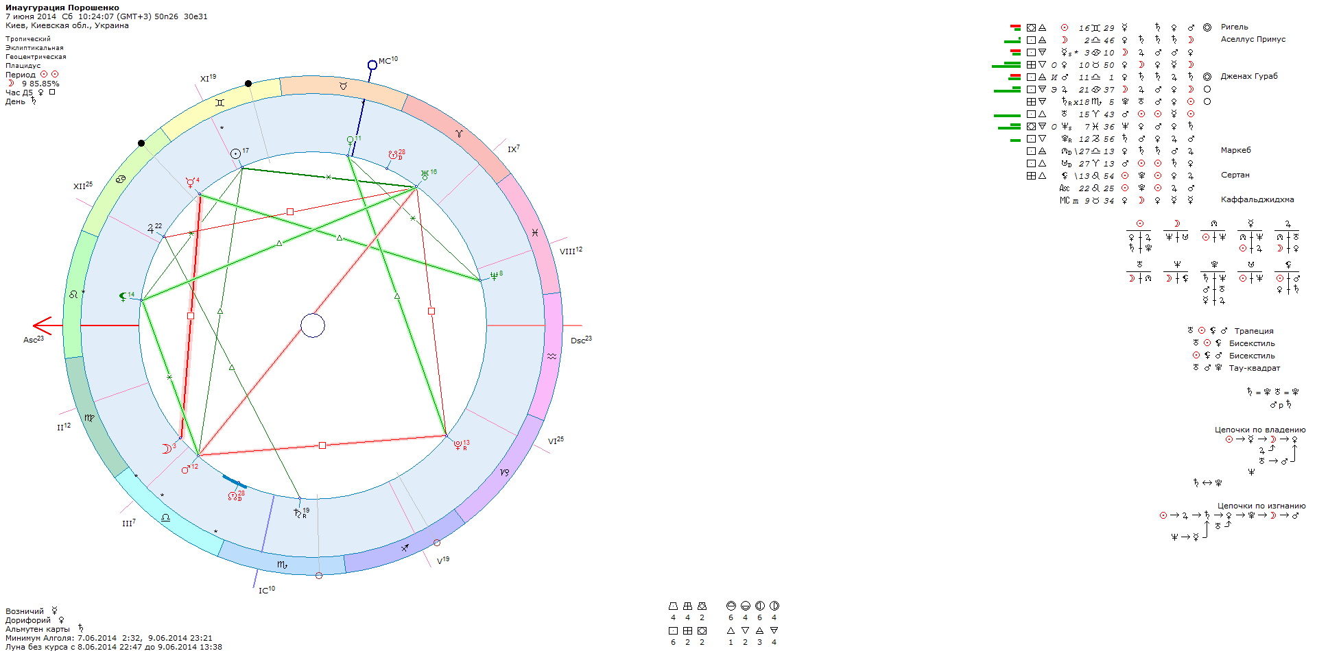 Что касается слабого Сатурна и неаспектированного Солнца - аналогичная ситуация наблюдается в карте инаугурации Ющенко, только хуже - там Солнце совсем без аспектов, Сатурн в изгнании. В нашей же карте мы имеем хотя бы расходящиеся аспекты Солнца и поддержку Сатурну со стороны сильного Юпитера.