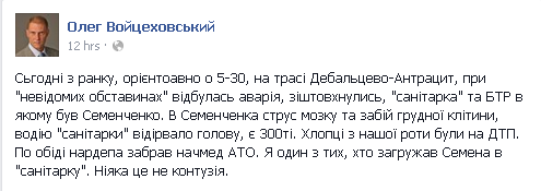 "У народного депутата, комбата "Донбасса" Семена Семенченко, кроме контузии, переломы и пробито легкое. Об этом на своей странице в Facebook сообщил народный депутат Украины Борис Филатов"